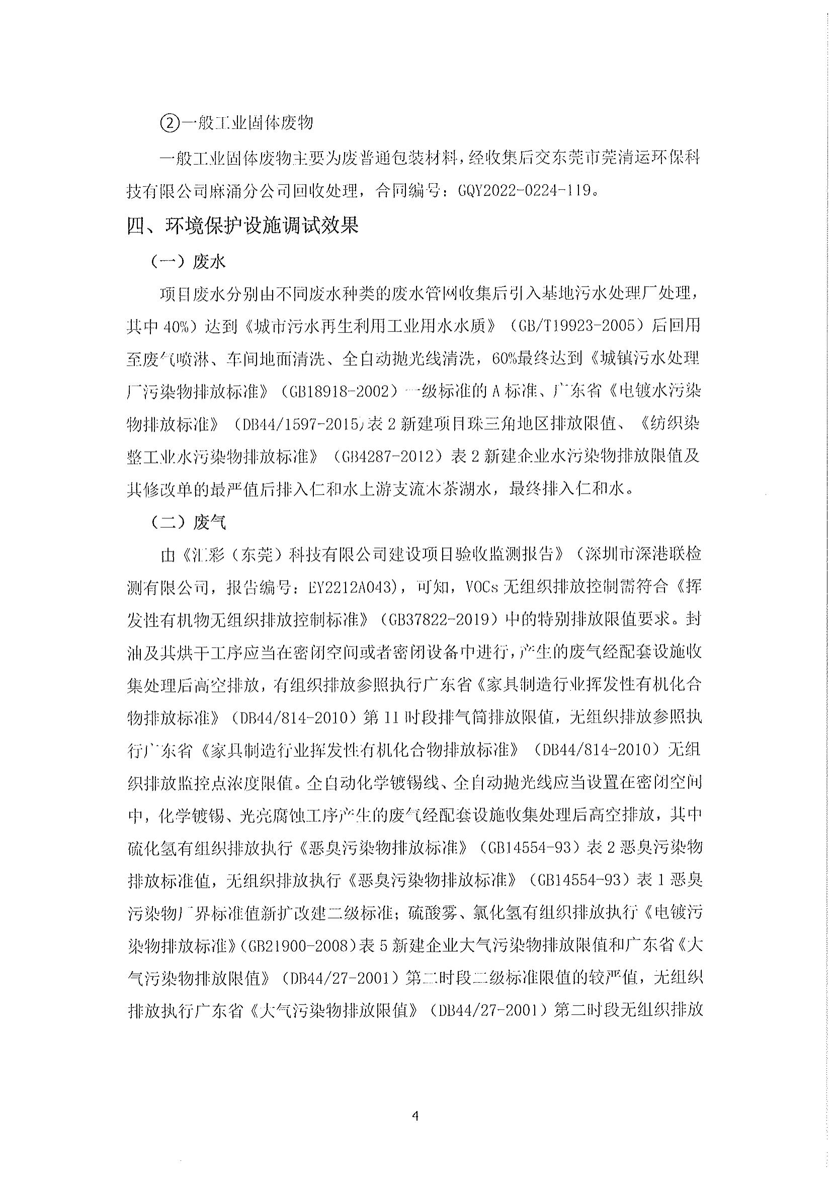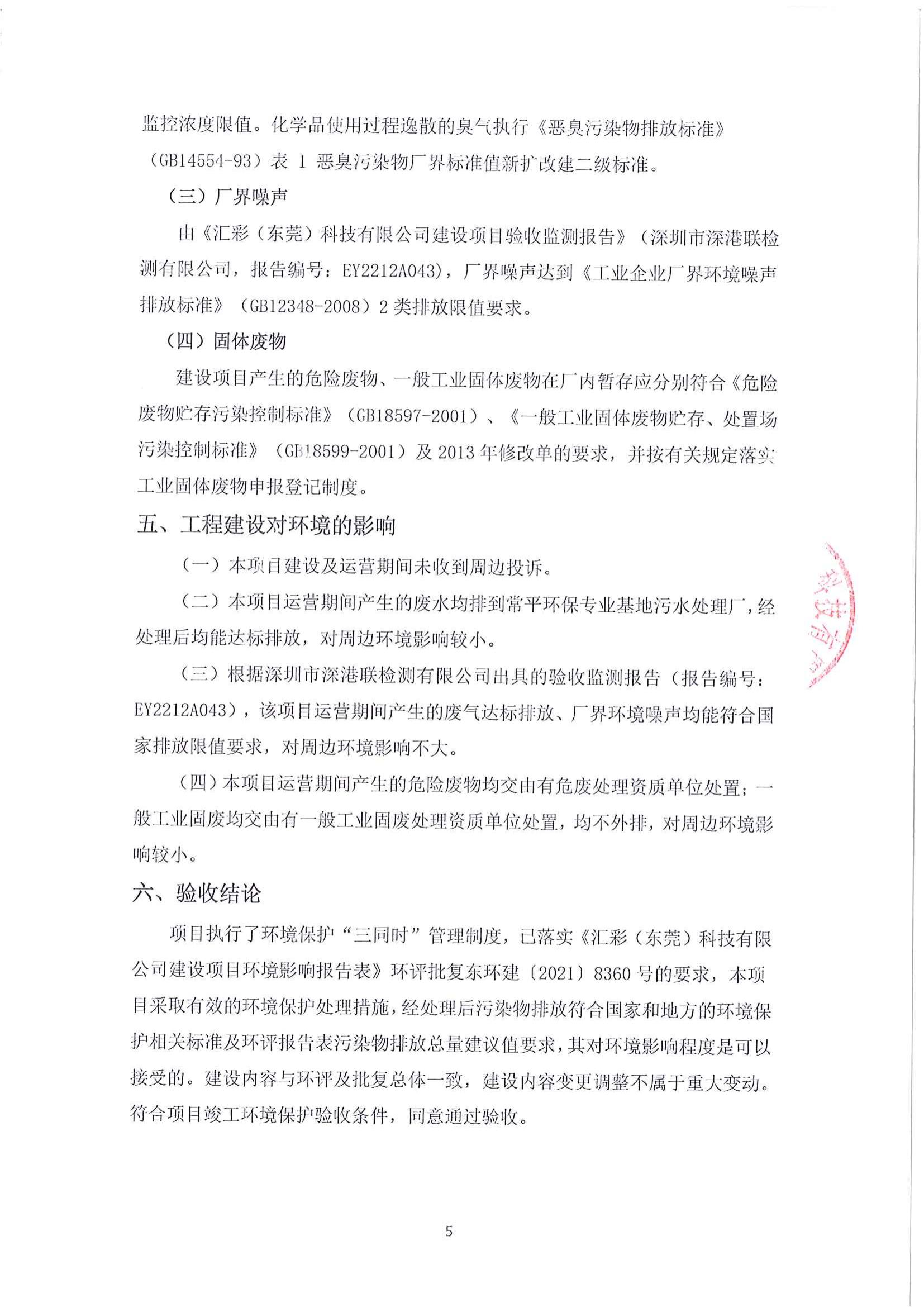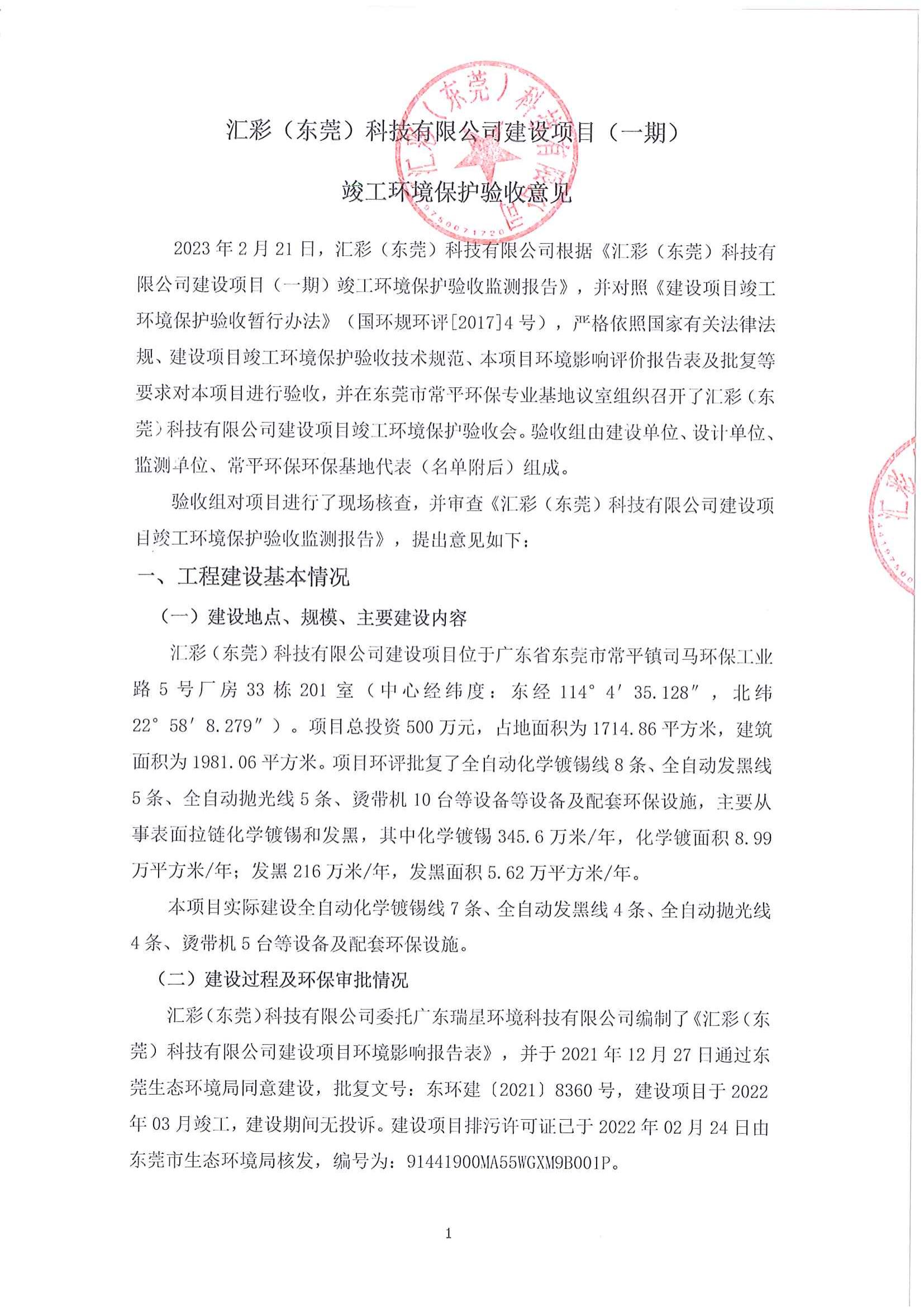 匯彩(東莞)科技有限公司建設項目 (一期) 竣工環境保護驗收意見
