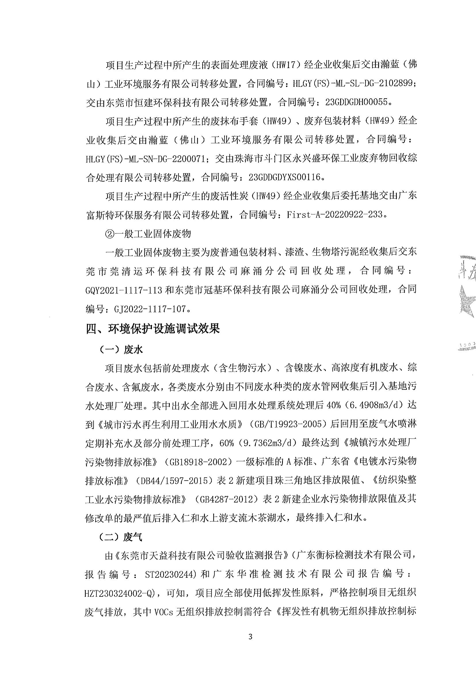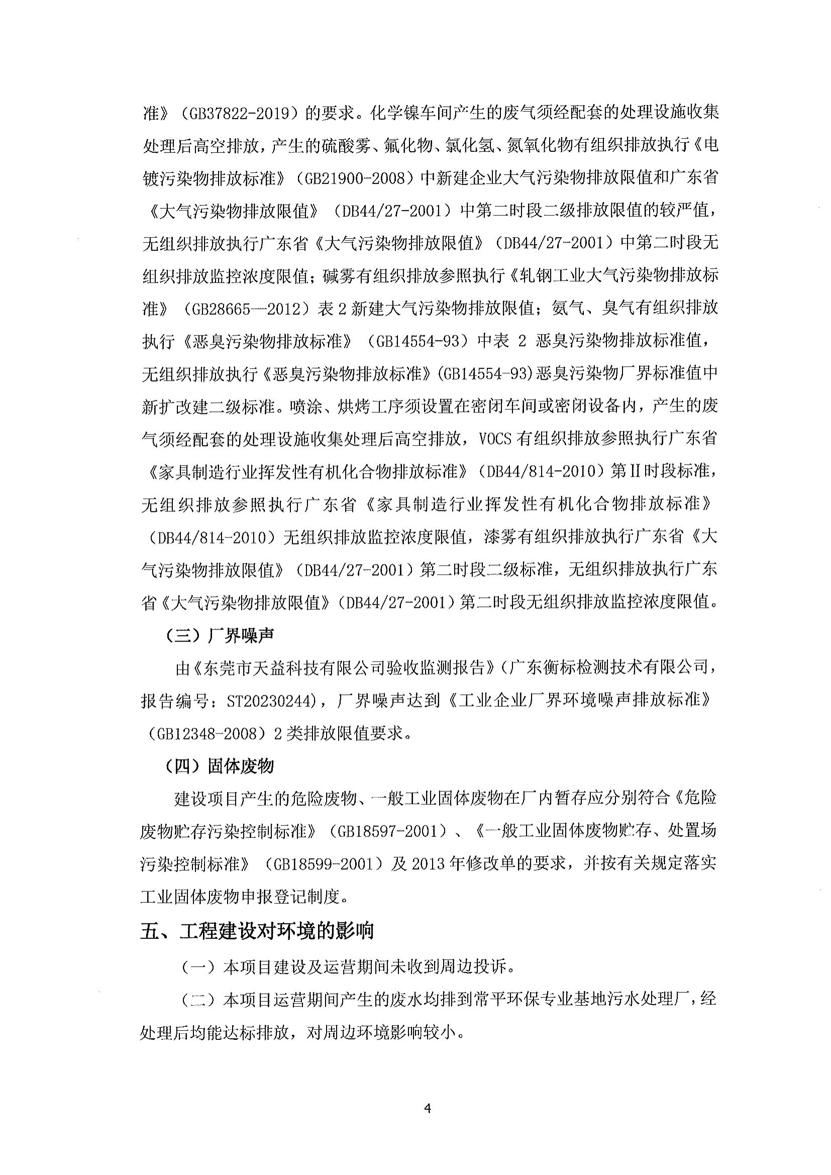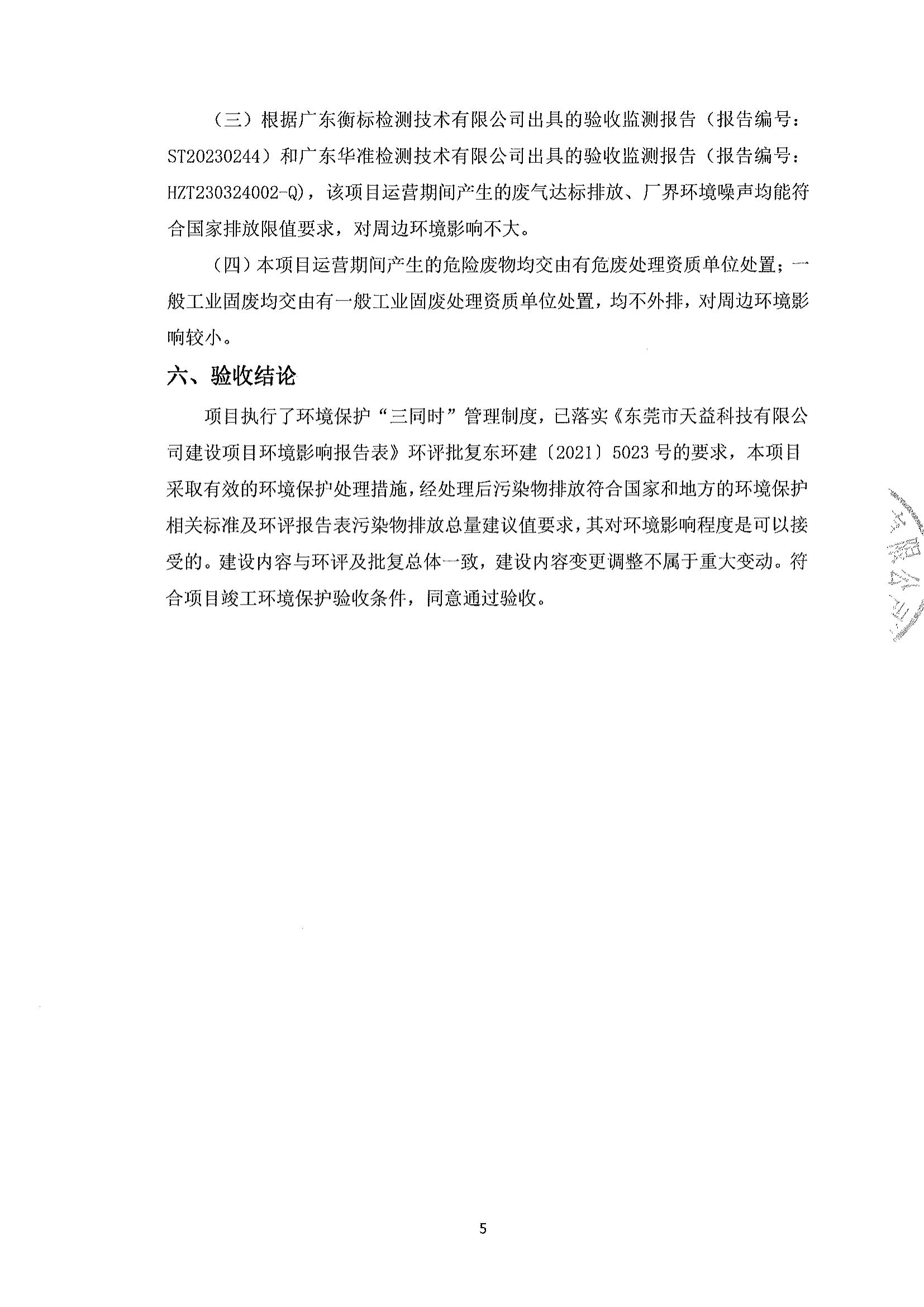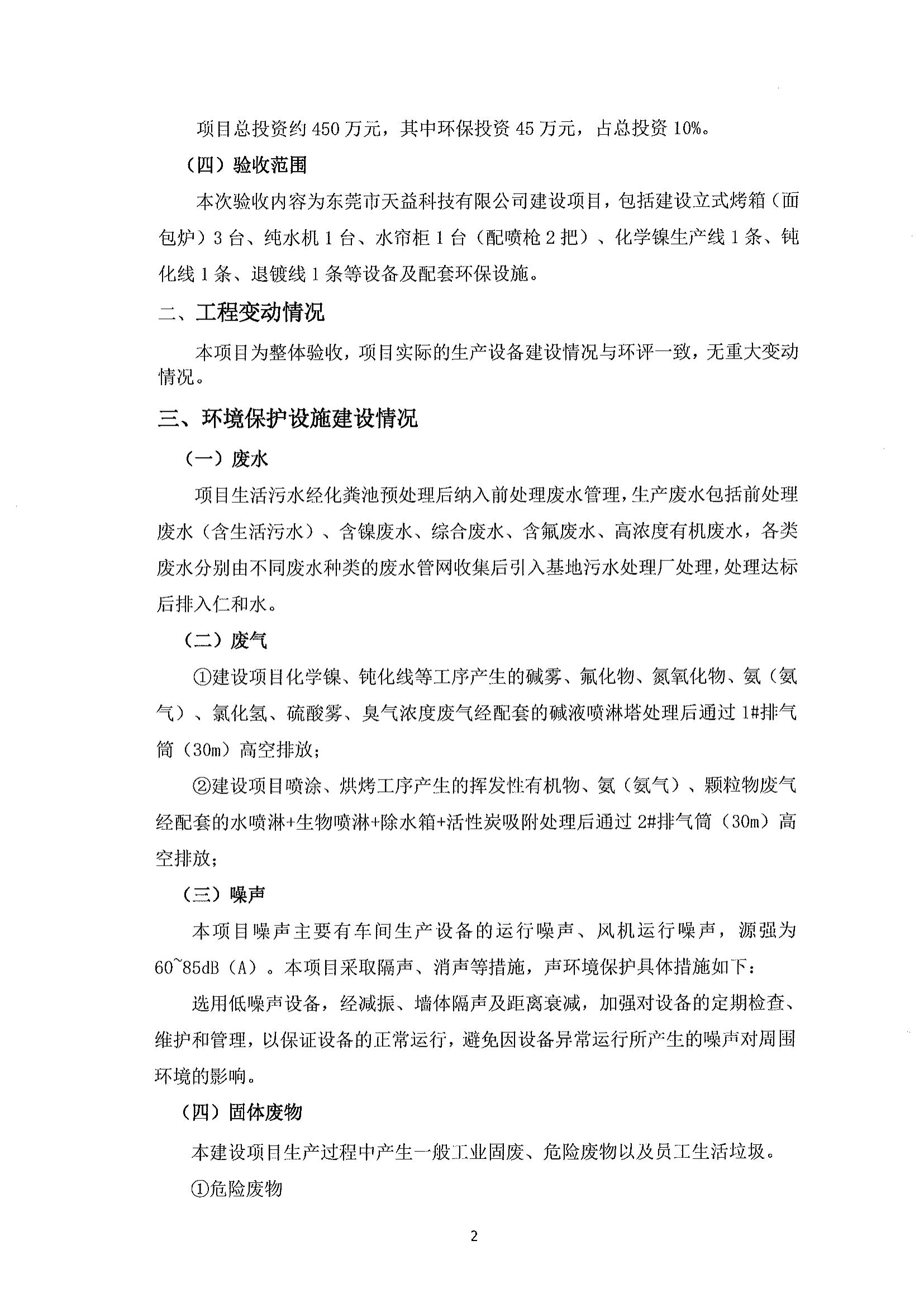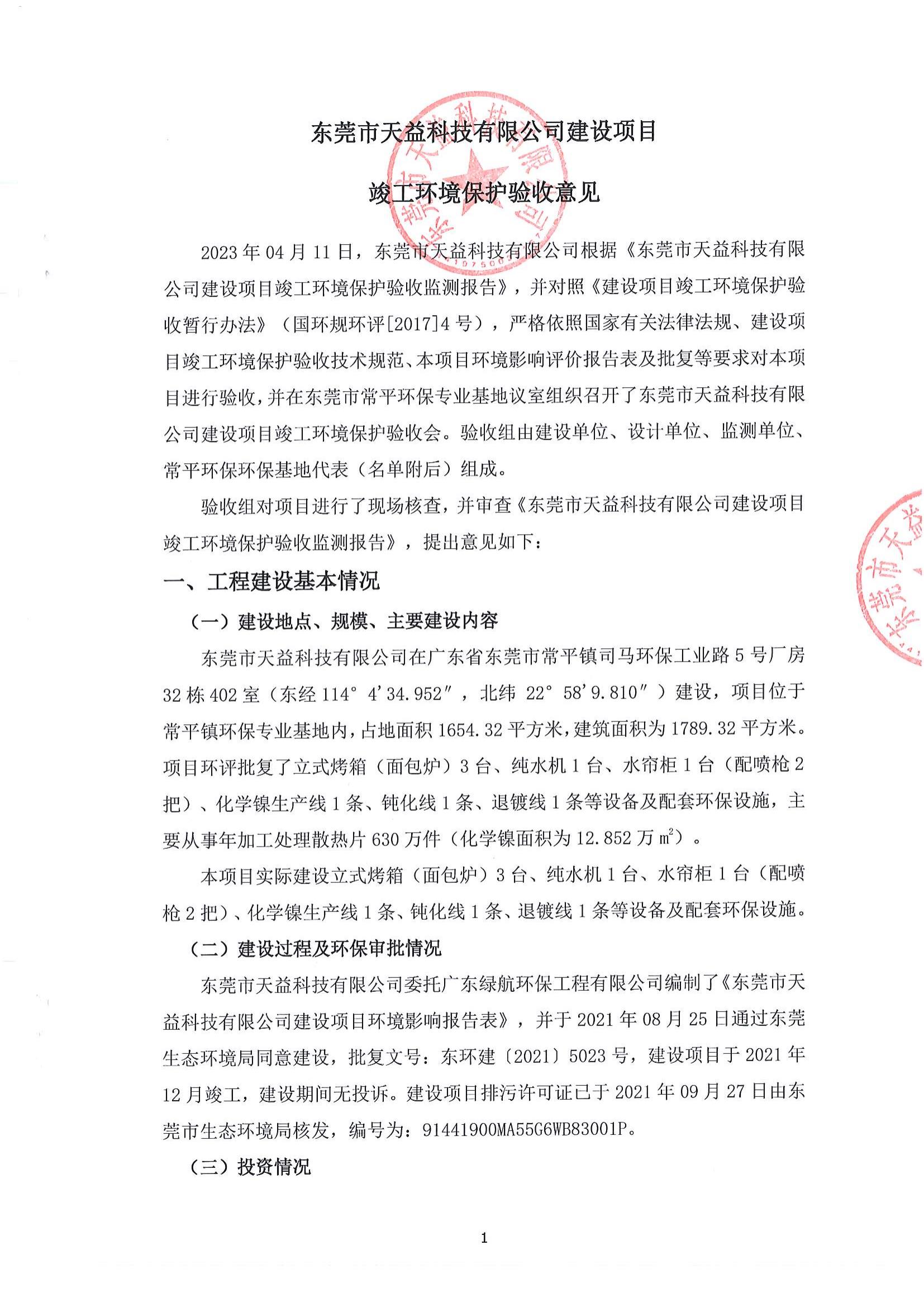 東莞市天益科技有限公司建設項目竣工環境保護驗收意見