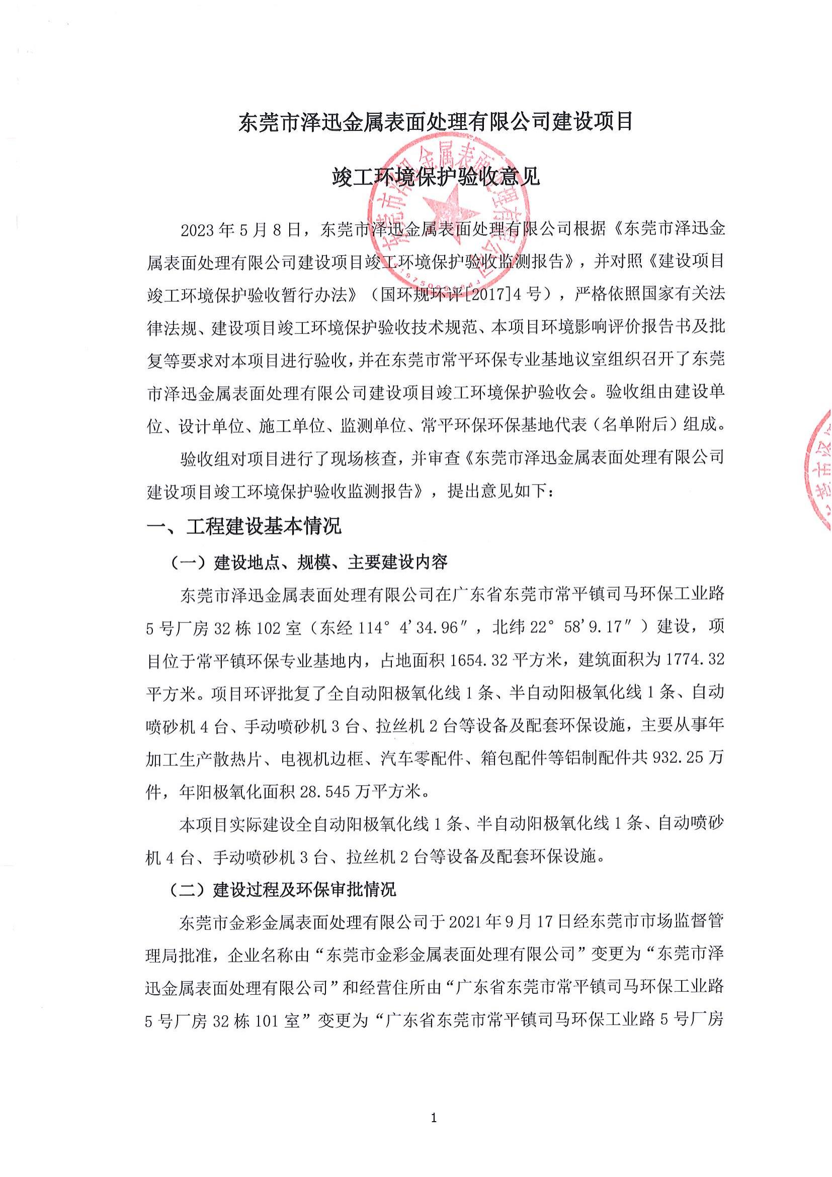東莞市澤迅金屬表面處理有限公司驗(yàn)收意見(jiàn)