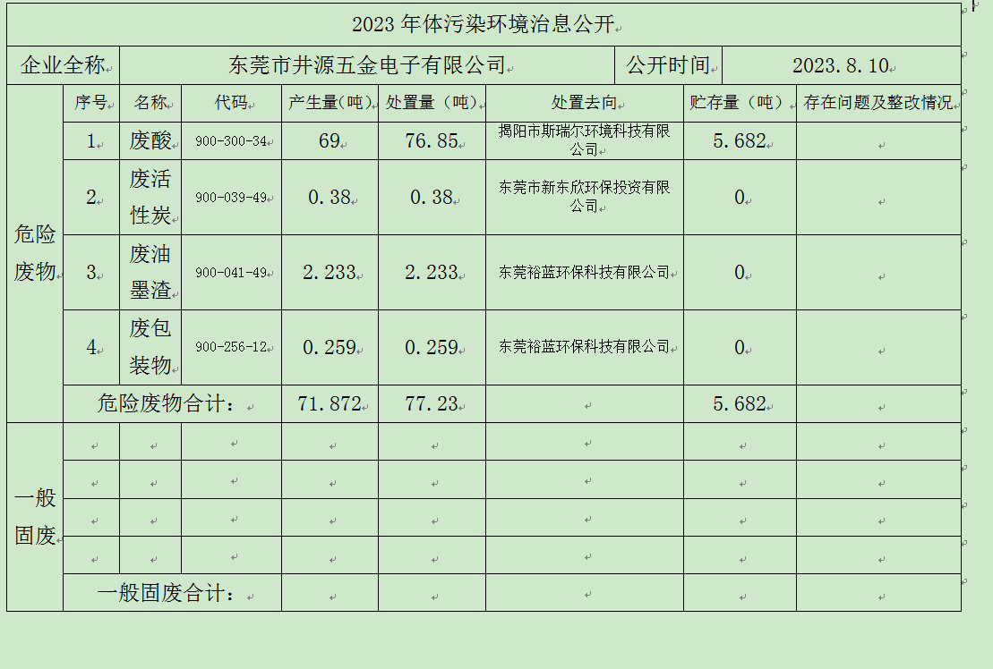 東莞市井源五金電子有限公司工業(yè)固廢信息公開