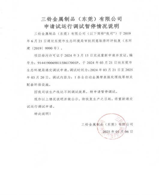 三鈴金屬制品(東莞)有限公司申請試運行調試暫停