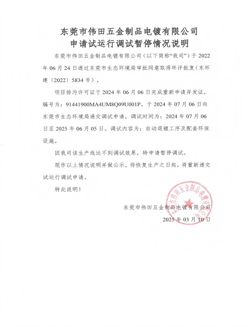 東莞市偉田五金制品電鍍有限公司調試暫停情況