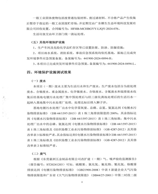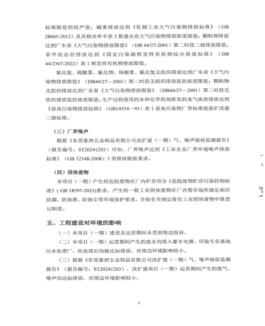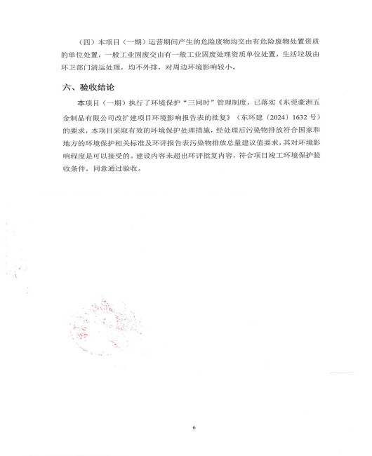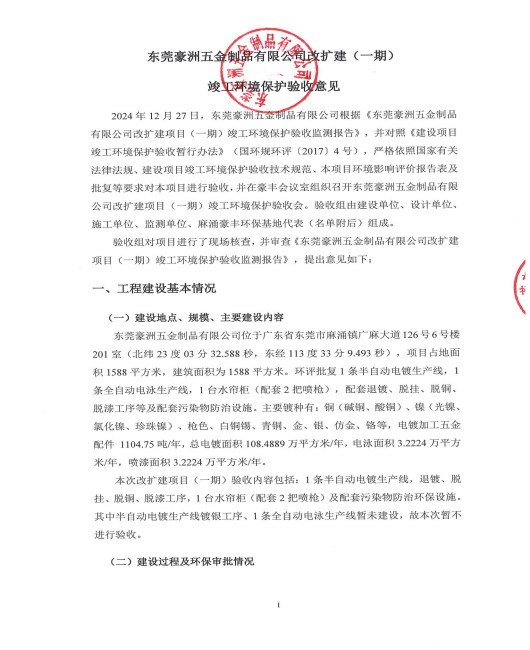東莞豪洲五金制品有限公司改擴建(一期)驗收意見