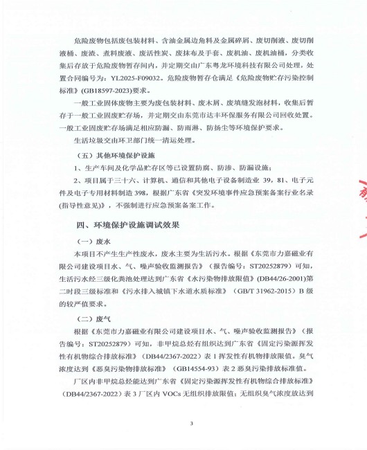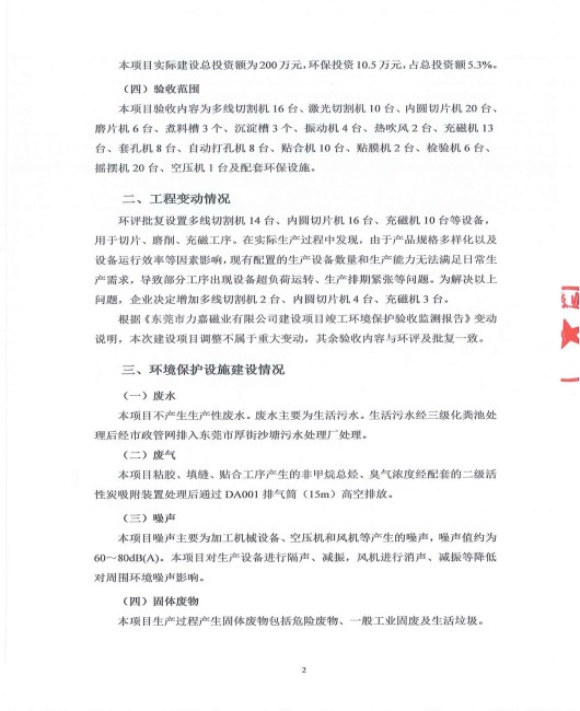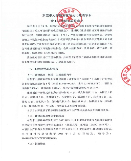 東莞市力嘉磁業(yè)有限公司建設(shè)項(xiàng)目驗(yàn)收意見