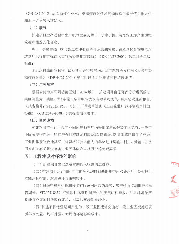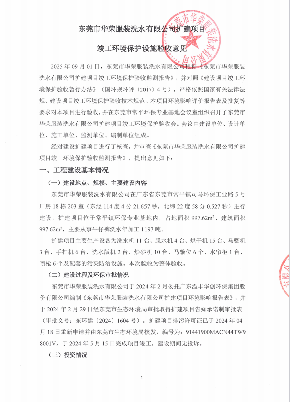 東莞市華榮服裝洗水有限公司擴建項目驗收意見